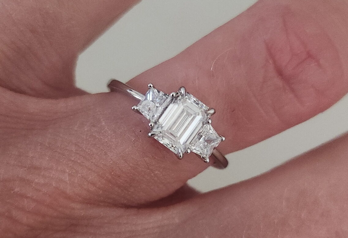 💎 Why This Piece Stands Out:  Striking 1.03 ct emerald-cut center diamond… Near-colorless F color for bright, icy brilliance… VS1 clarity for exceptional purity… Elegant three-stone setting with symbolic meaning… A modern, responsible luxury choice